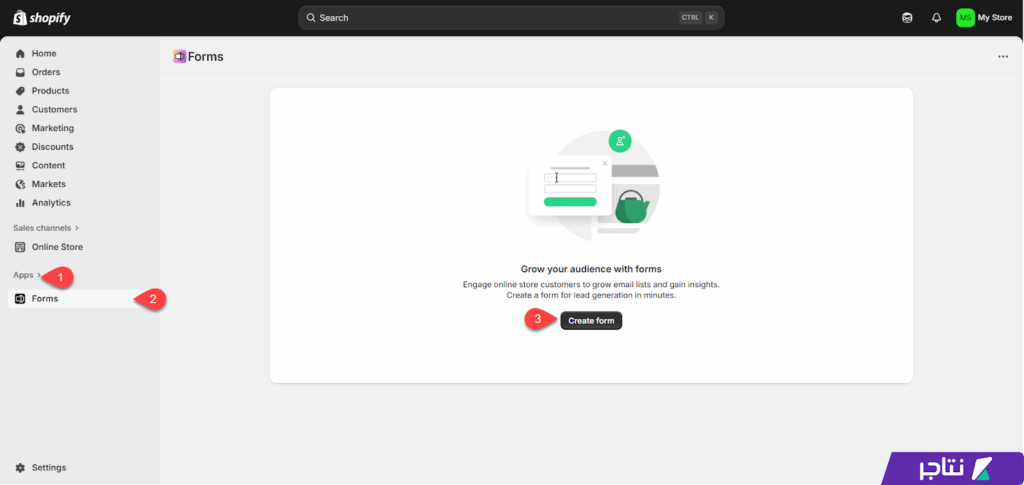 بعد تفعيل تطبيق Shopify Forms على المتجر، انتقل من الشريط الجانبي إلى قائمة Apps ثم اختر Forms. سيتم توجيهك إلى لوحة إدارة النماذج داخل المتجر، وهناك اضغط على زر Create Form لإنشاء نموذج جديد.