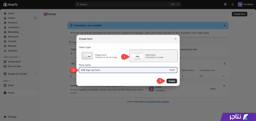 وبما أن هدفنا إنشاء نموذج B2B مخصص، سنختار خيار Inline Form. بعدها أدخل اسم النموذج المطلوب، ثم اضغط على زر Create لإنشائه على المتجر.