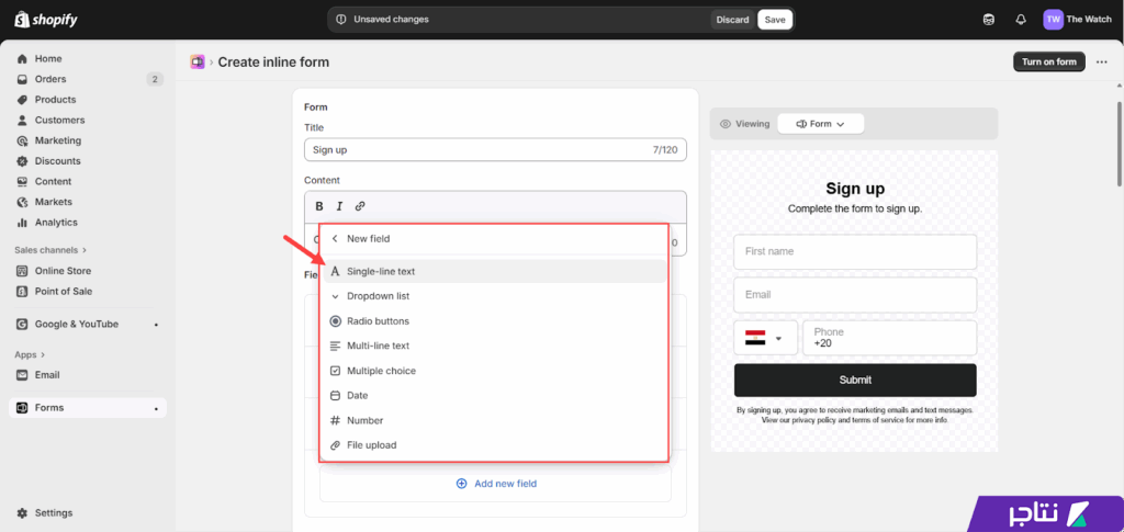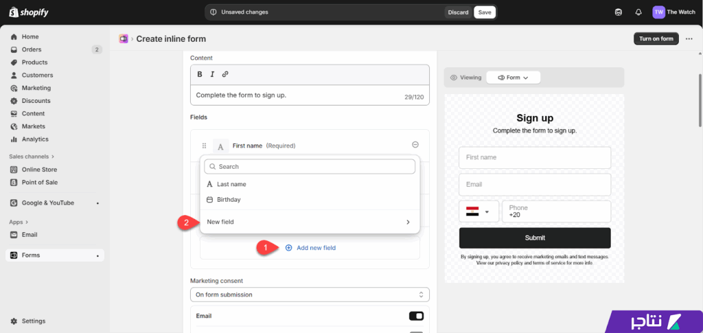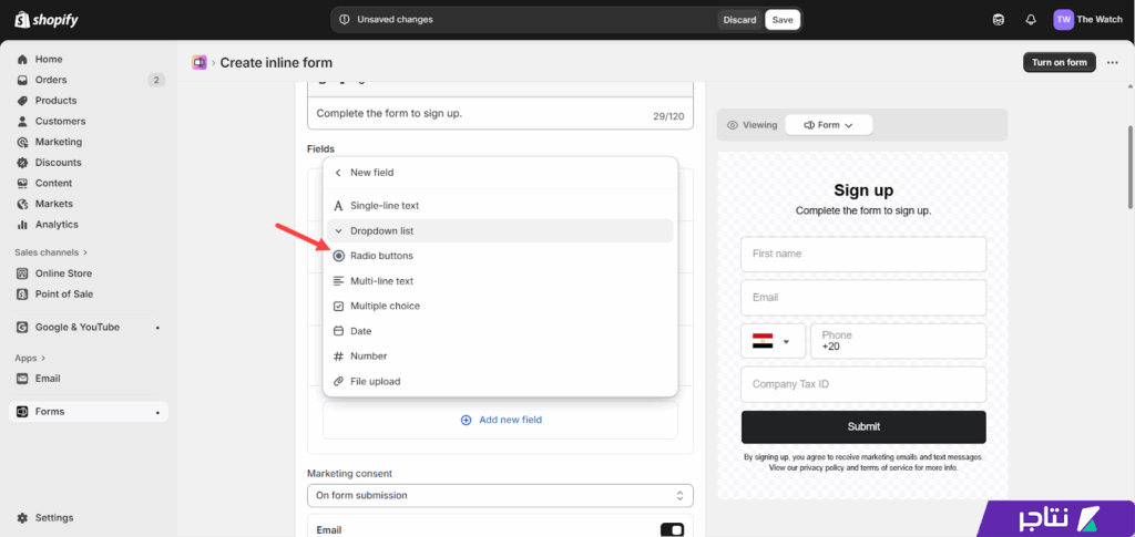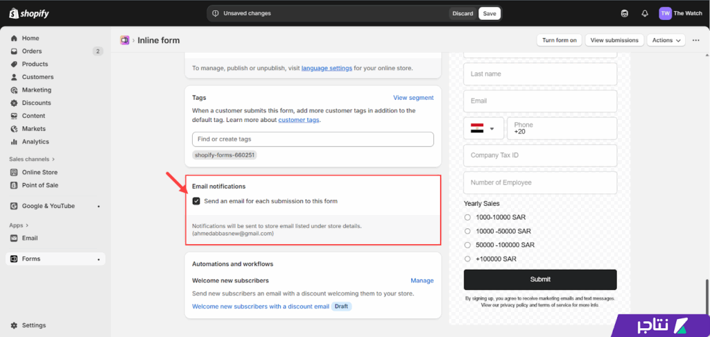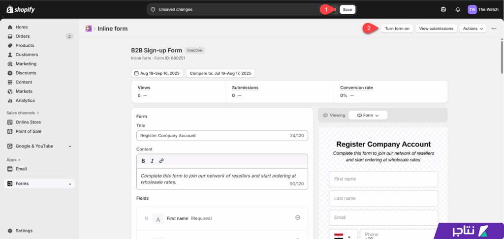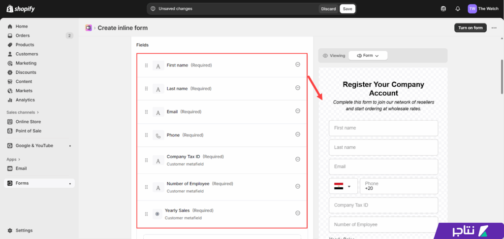 عقب ذلك نحفظ إعدادات النموذج بالكامل عبر الضغط على زر Save من الشريط العلوي، ثم نضغط على زر Turn Form On لتفعيل النموذج على المتجر.
