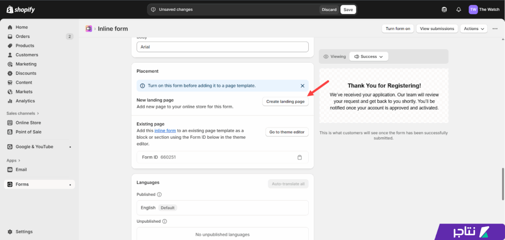 أخيرًا أصبح النموذج جاهزًا للاستخدام على المتجر، والخطوة الأخيرة هي تفعيل صفحة التسجيل المرتبطة به. لذلك، ننتقل إلى قسم Placement في صفحة النموذج، ثم نضغط على زر Create Landing Page كما هو واضح في الصورة التالية: