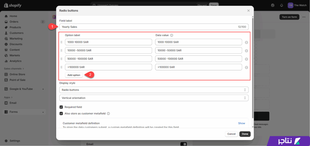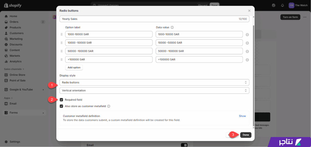 ثم اخترت طريقة العرض المناسبة سواء كقائمة منسدلة أو كخيارات مضمنة بالنموذج، وحددت ما إذا كان الحقل إجباريًا أو اختياريًا. بعد ذلك أضفت الحقل إلى النموذج عبر الضغط على زر Done.