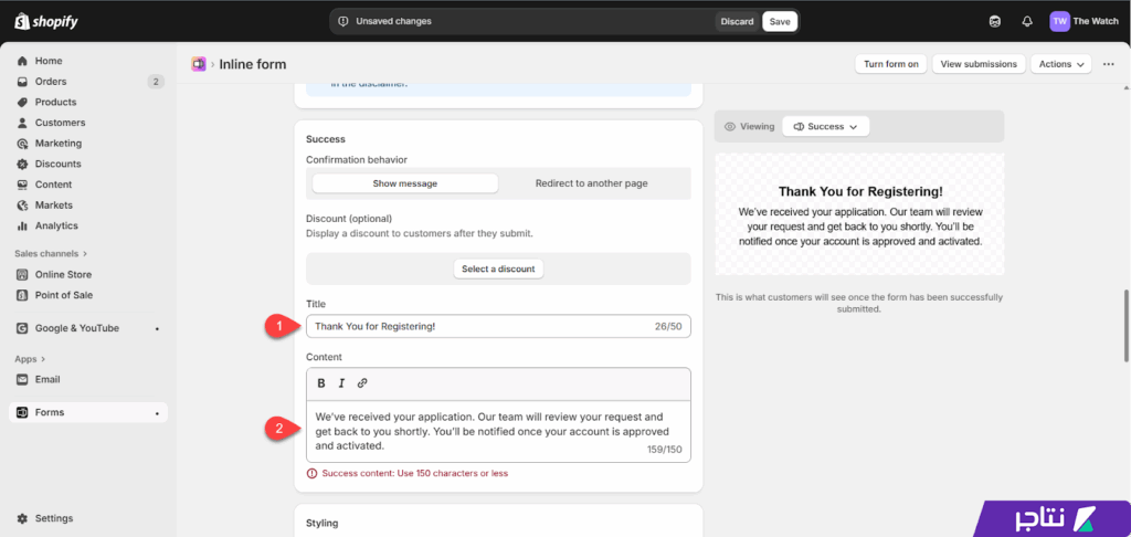 بعد ذلك، نحدد النتيجة التي يحصل عليها العميل عند إتمام التسجيل في النموذج من قسم Success. في متجري فضّلتُ إظهار رسالة توضّح له أنه سيتم مراجعة طلبه من قبل الإدارة والتواصل معه لتفعيل حسابه في أقرب وقت، كما هو موضح في الصورة التالية: