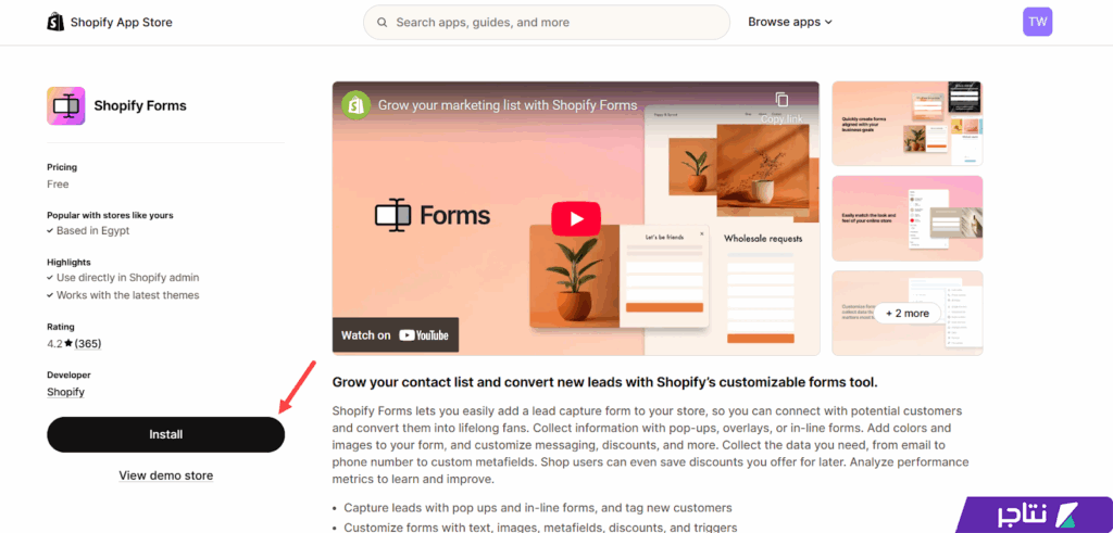 عادةً ستجد التطبيق مثبتًا مسبقًا على متجرك في شوبيفاي، لكن في حال لم يكن مفعّلًا يمكنك التوجّه إلى متجر تطبيقات شوبيفاي والبحث عن Shopify Forms، ثم تثبيته على متجرك بالضغط على زر Install كما هو موضح في الصورة التالية: