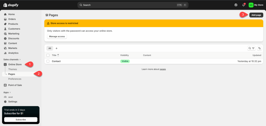 لذلك، توجّهت إلى لوحة تحكم شوبيفاي لإنشاء صفحة جديدة، وذلك من خلال اختيار Online Store من القائمة الجانبية، ثم الدخول إلى قسم Pages، وبعدها الضغط على Add Page لإنشاء صفحة جديدة.