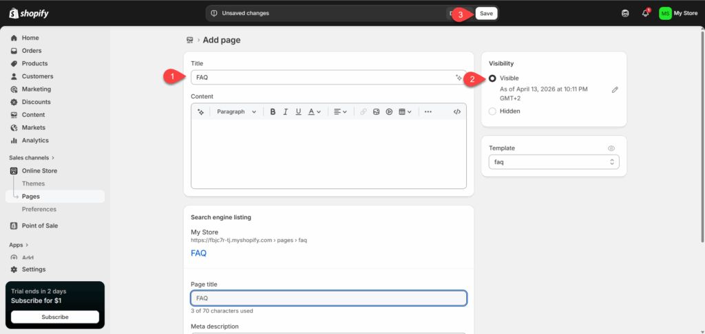بعد ذلك، حدّدت اسم الصفحة "FAQ"، ثم اخترت خيار Visible من تبويب Visibility لنشر الصفحة على المتجر، وأخيرًا ضغطت على Save لحفظ الإعدادات.
