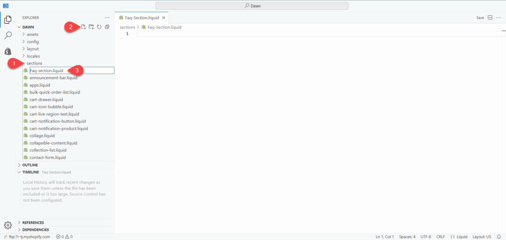 بعد ذلك، فتحت مجلد Sections، ثم أنشأت ملفًا جديدًا عبر خيار New File، وقمت بتسميته Faq-Section.liquid (مع إمكانية اختيار اسم آخر، بشرط أن يكون بامتداد .liquid).