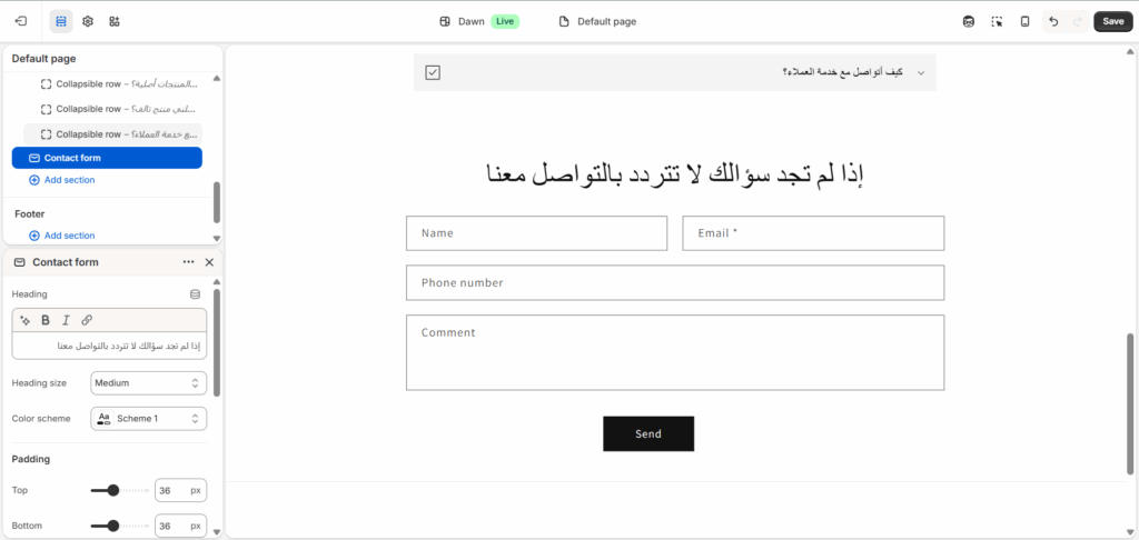 بعد الانتهاء من إضافة جميع الأسئلة، يُفضَّل إضافة قسم للتواصل، لزيادة فاعلية صفحة الأسئلة الشائعة، بحيث يتمكن العميل من التواصل مع الدعم مباشرة في حال عدم العثور على إجابته، مما يساهم في تحسين تجربة المستخدم.