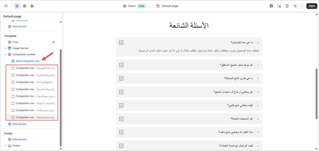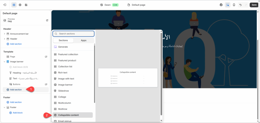 ثم أضفت قسمًا جديدًا للأسئلة الشائعة من خلال الضغط على زر Add Section، واختيار قسم مخصص للأسئلة الشائعة مثل Collapsible content.