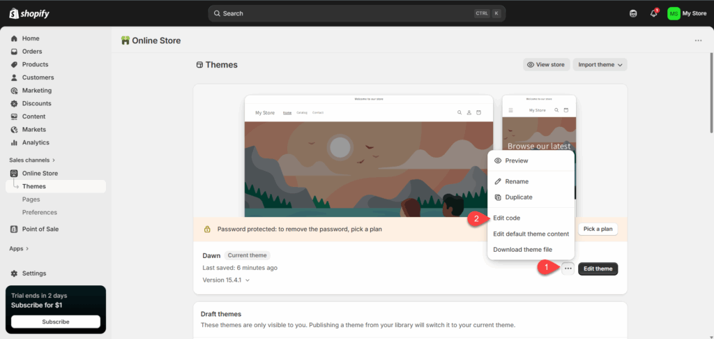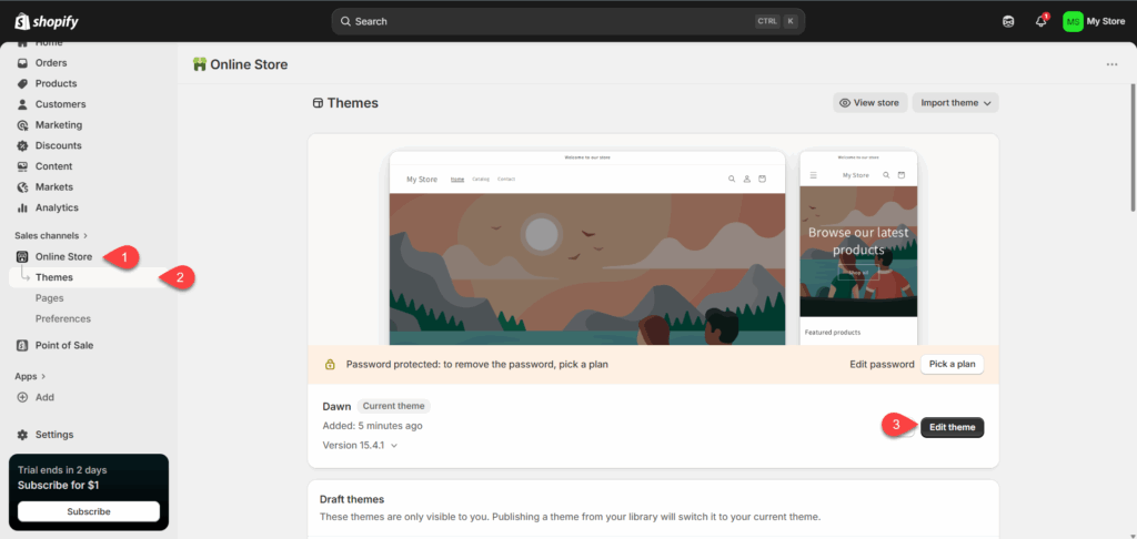 الآن، توجّهت إلى إعدادات القالب في المتجر عبر المسار Online Store >> Themes، ثم الضغط على زر Edit Theme.