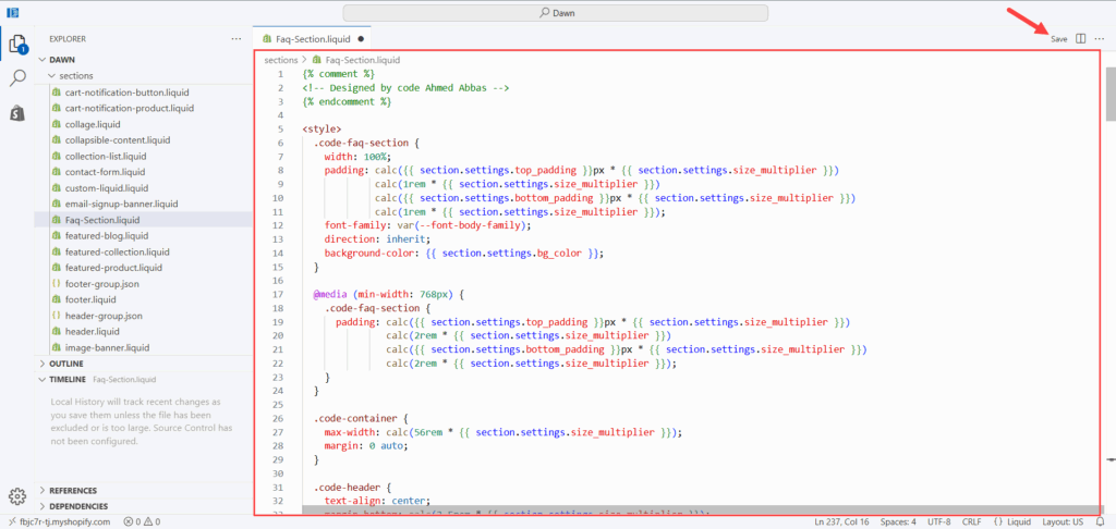 بعد إضافة الكود، أضغط على زر Save لحفظ القسم وإضافته إلى القالب.