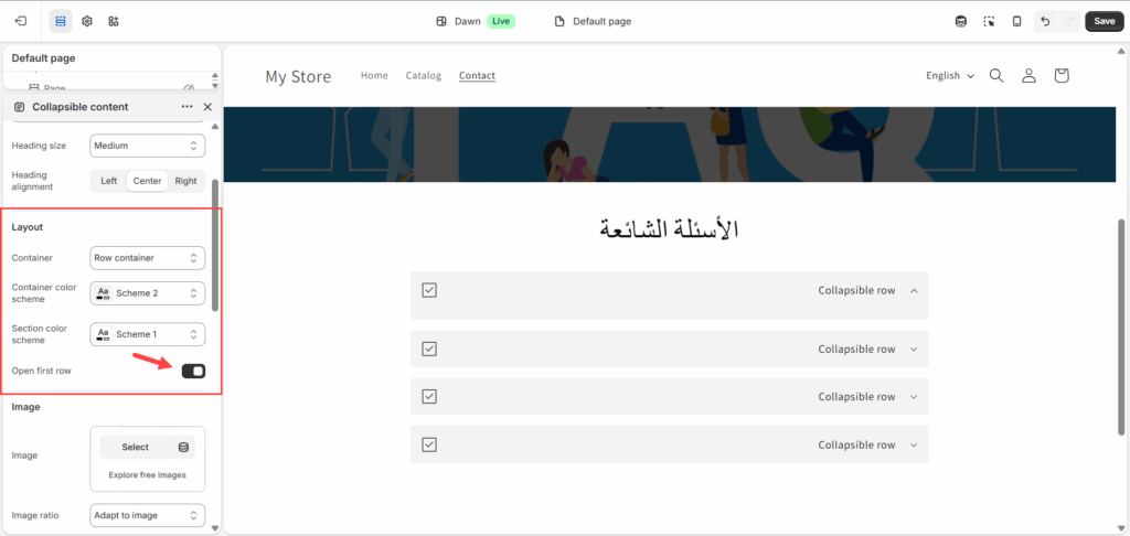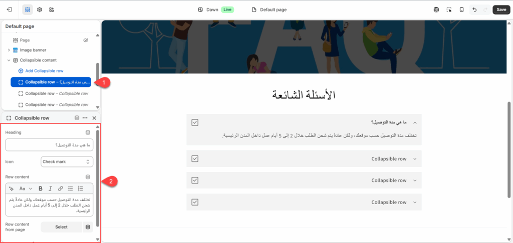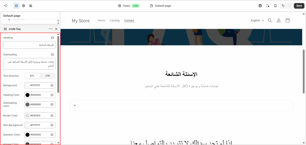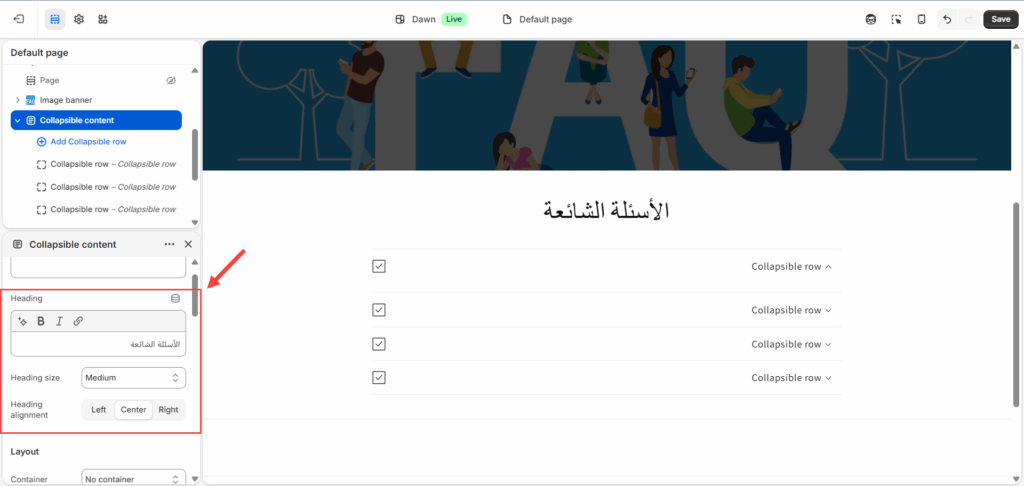بعد ذلك، بدأت بتخصيص محتوى القسم، حيث حدّدت العنوان ليكون "الأسئلة الشائعة"، وعدّلت اتجاه الكتابة وحجم النص بما يتناسب مع قالب المتجر.