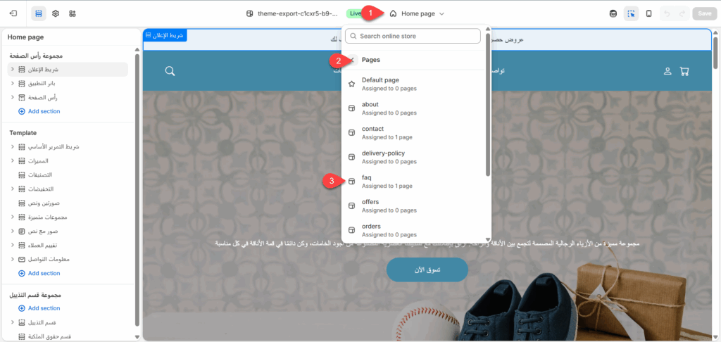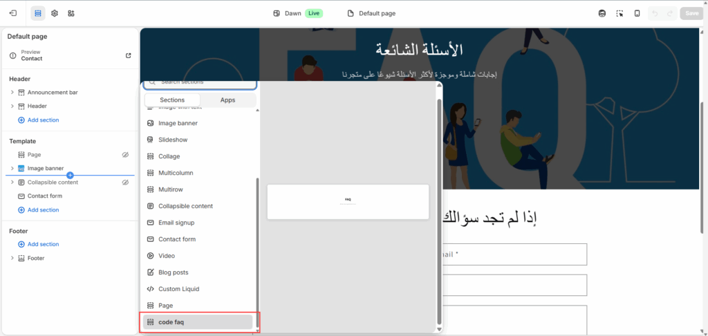 بعد ذلك، توجه إلى صفحة الأسئلة الشائعة، وأضف قسمًا جديدًا، ستلاحظ ظهور قسم جديد باسم FAQ Code ضمن أقسام المتجر.