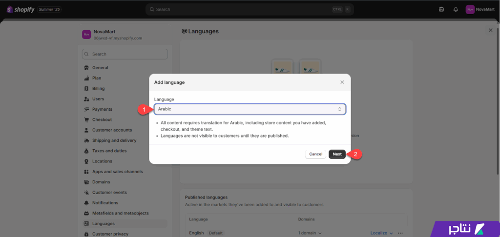 بعد ذلك، اختر اللغة الجديدة التي تريد إضافتها إلى المتجر (Arabic)، ثم اضغط على زر Next.
