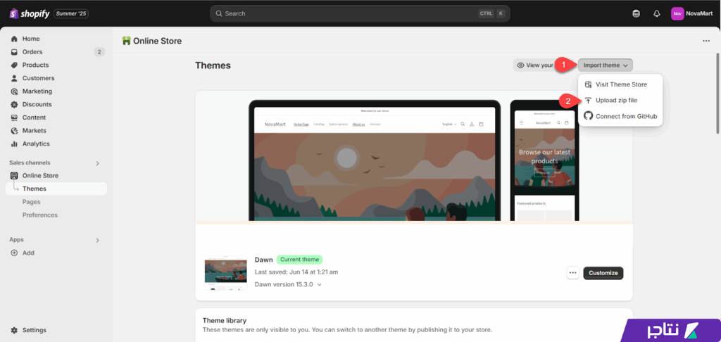 الخطوة الأولى، انتقل إلى قسم القوالب في متجرك، ثم اختر Import Theme من الشريط العلوي، ومنه اختر Upload zip file لرفع قالب جديد على المتجر.