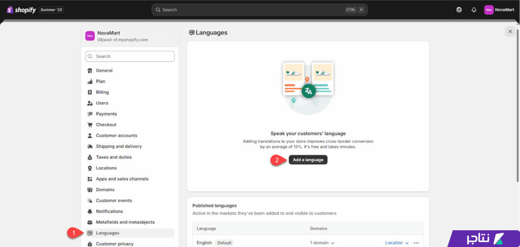 لذلك، توجه إلى إعدادات شوبيفاي، ثم اختر تبويب Languages من القائمة الجانبية، ومنها اضغط على زر Add a Language.