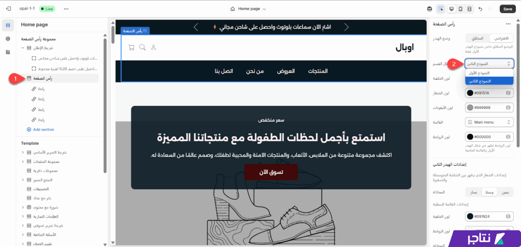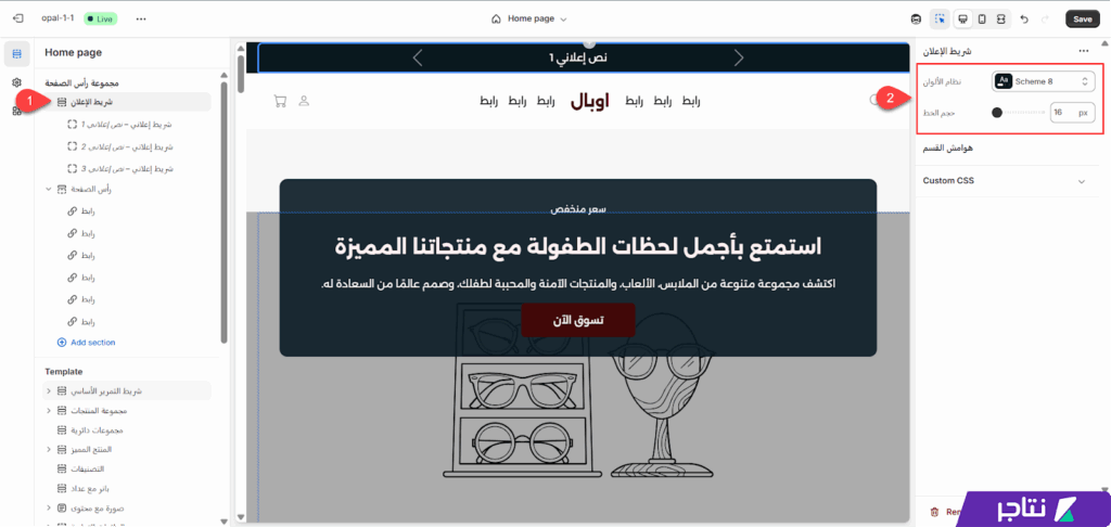 ابدأ بتعديل الشريط العلوي في المتجر، ويضم قالب أوبال شريط إعلانات علوي يمكنك التعديل عليه بسهولة من حيث المحتوى، الألوان، الحجم، والهوامش بما يتوافق مع هوية متجرك الأساسية.