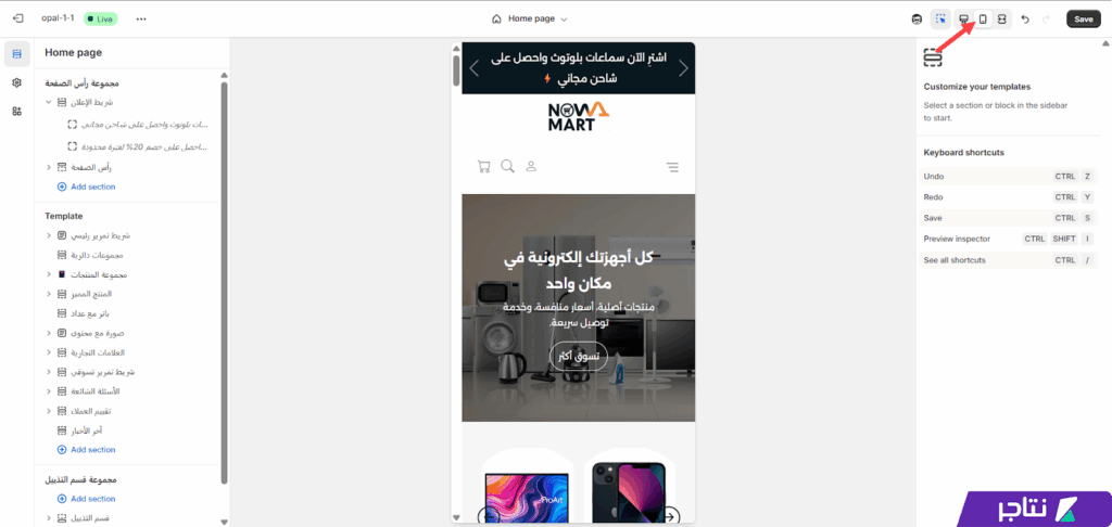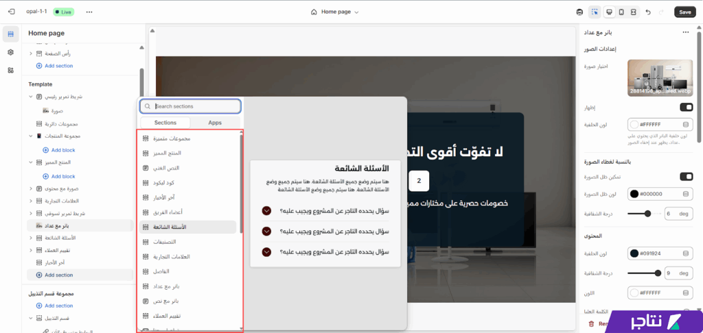 يمتاز قالب أوبال بتوافر ما يقارب 26 قسمًا، مما يساعدك على تلبية كافة احتياجاتك في تخطيط صفحات متجرك الرئيسية. بداية، تستطيع بسهولة التعديل على الأقسام الجاهزة المتوفرة مع القالب.