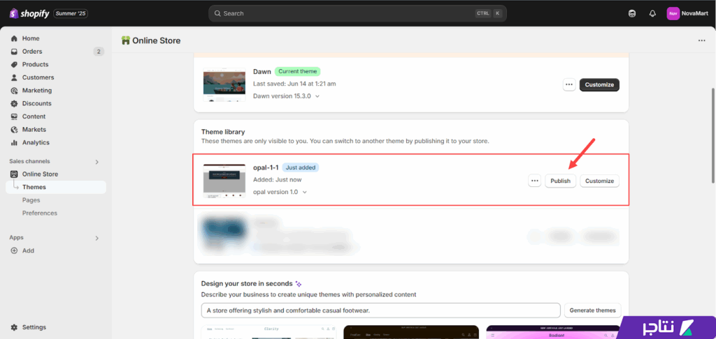 حدد ملف القالب من جهازك، ثم انتظر حتى يتم رفع وتثبت القالب على المتجر. بعد ذلك، اضغط على "Publish" لنشر القالب على متجرك.