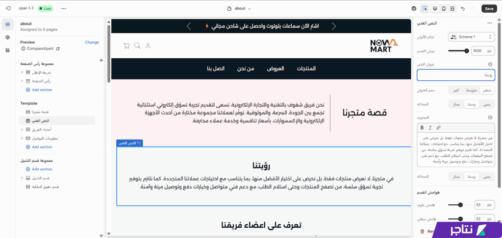 بعد ذلك، انتقلت إلى صفحة "من نحن"، وكتبت قصة المتجر، الهدف، الرسالة، الرؤية، أعضاء الفريق، وكافة المعلومات الأساسية عن متجرنا.