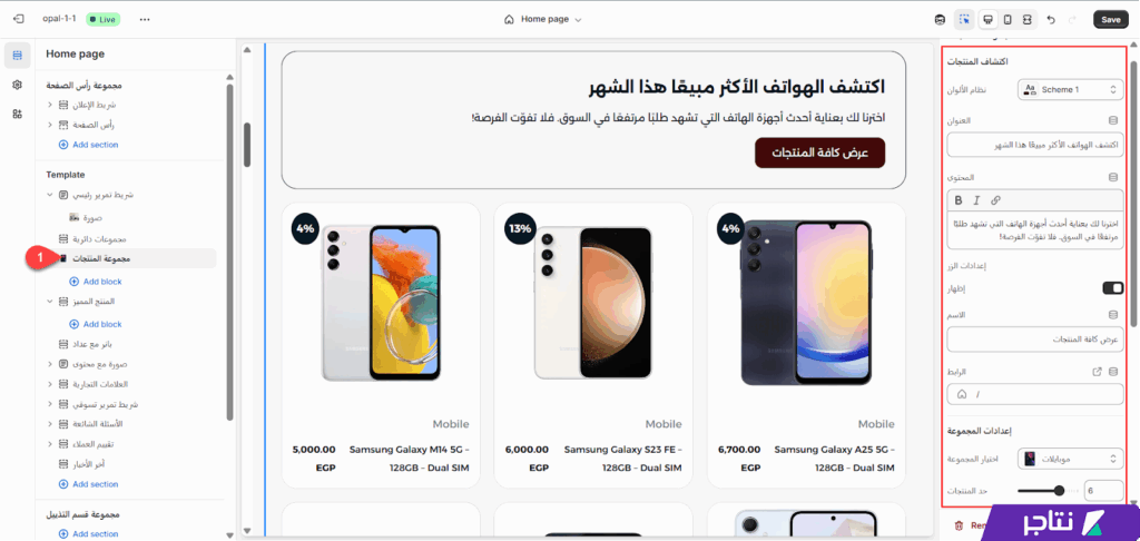 ثم يمكنك التعديل على قسم مجموعة المنتجات، حيث يمكنك تحديد تصنيف معين أو مجموعة منتجات مميزة من المتجر، والإعلان عنها بشكل بارز، مثل: المنتجات الأكثر مبيعًا، المنتجات المميزة، الخصومات، وغيرها من الأفكار التسويقية.