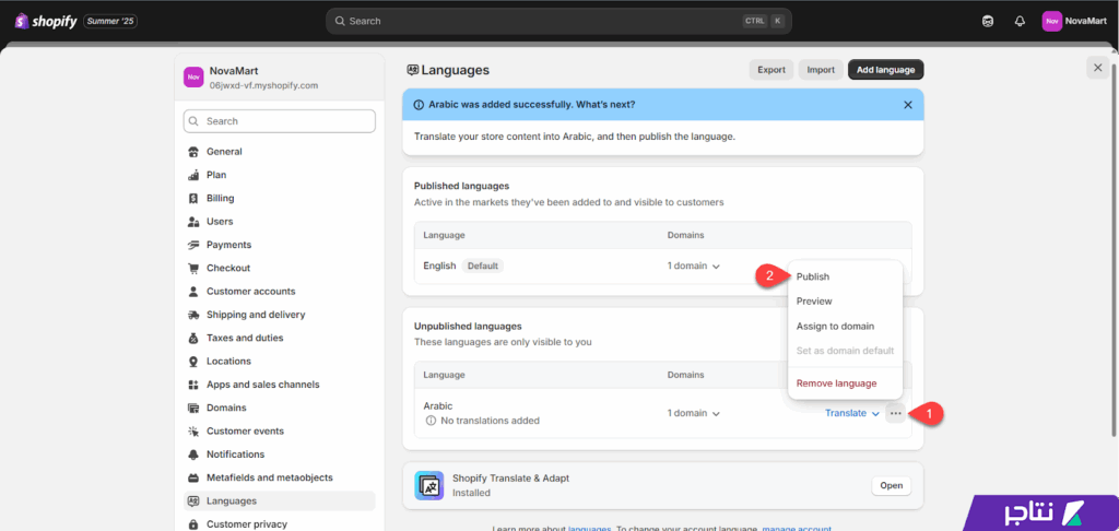 بعد تثبيت اللغة، اضغط على زر الخيارات المجاور لها، ثم اختر Publish لنشر اللغة على المتجر.