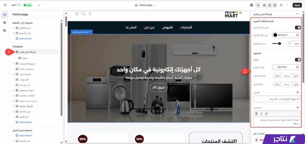 على سبيل المثال، يمكنك البدء بالتعديل على شريط التمرير الرئيسي في المتجر، من حيث تضمين البنرات الإعلانية، النصوص التسويقية، روابط التحويل، مع تخصيصها من حيث الألوان، المحاذاة، التنسيق، حتى تتكامل مع هوية متجرك المطلوبة.