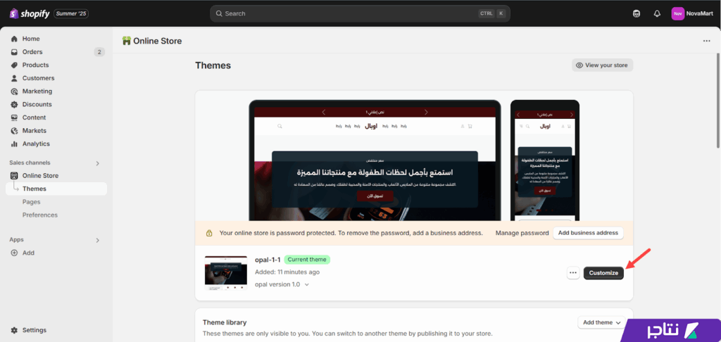 لتخصيص جميع عناصر القالب، انتقل إلى إعدادات القالب على شوبيفاي، ثم اضغط على زر "Customize" كما هو موضح في الصورة التالية:
