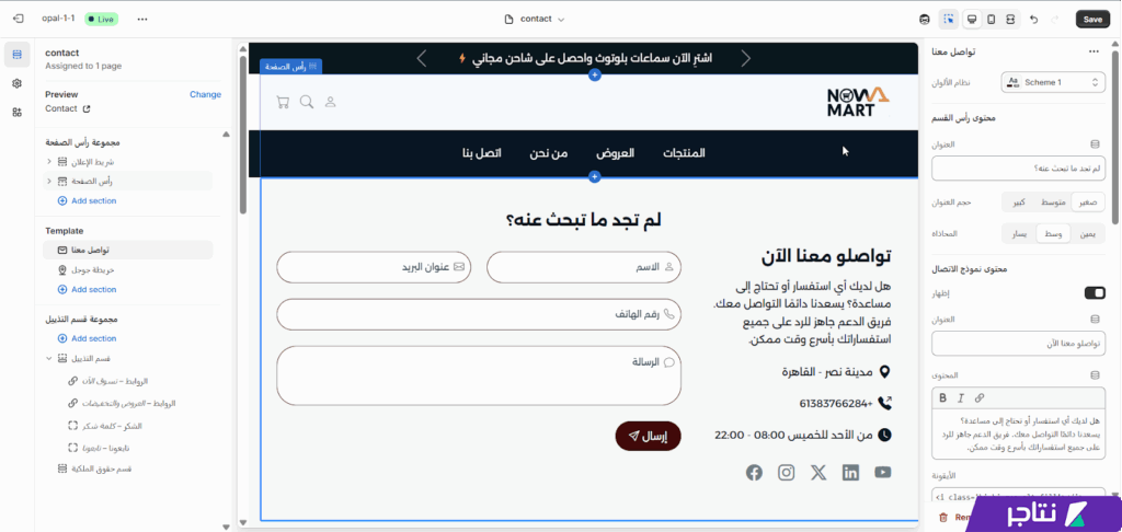 لذا بدأت بتعديل صفحة "اتصل بنا" من حيث معلومات التواصل، العنوان، ومواعيد العمل، كما هو موضح في الصورة التالية: