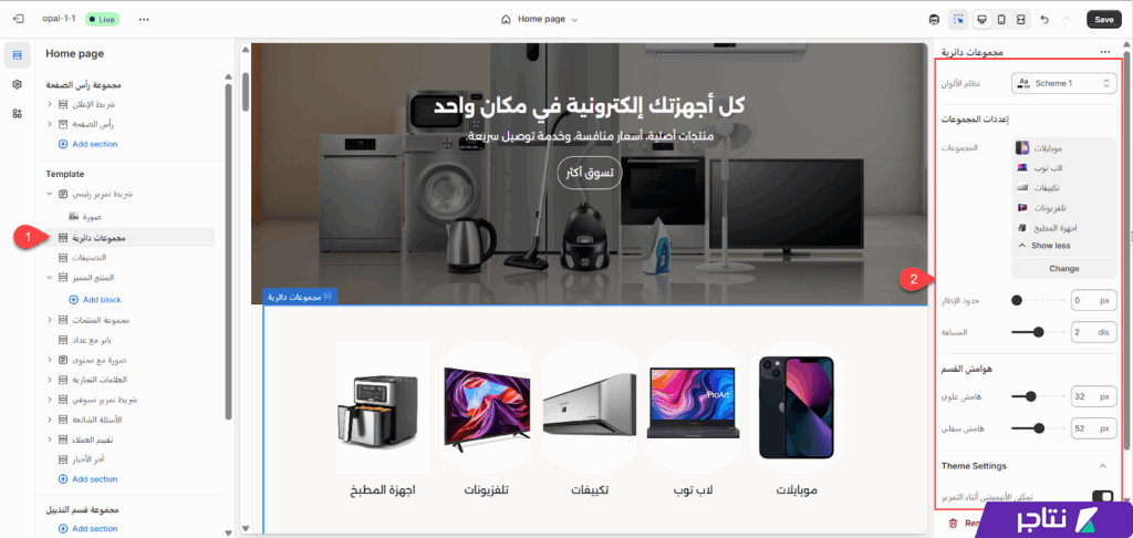 بعد ذلك، يمكنك تحديد قسم المجموعات، ثم اختيار تصنيفات المنتجات المستهدفة من متجرك، والتحكم في طريقة عرضها من حيث الهوامش، الحدود، المسافات، الحركات (الأنيميشن)، وغير ذلك.