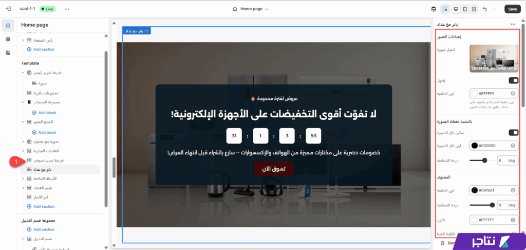 يوفر قالب أوبال أيضًا عدة أقسام تسويقية مثل: البنرات الإعلانية، قسم الخصومات، البانر مع العداد، مجموعة الصور، وغيرهم الكثير، لذا يمكنك الاعتماد عليها في الترويج لعروضك ومنتجاتك على الواجهة الرئيسية.