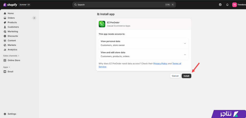 عقب ذلك، طلب التطبيق منح بعض الصلاحيات المرتبطة بالمتجر مثل الوصول إلى بيانات المنتجات والطلبات والعملاء لإمكانية تضمين طلبات الحجز المسبق على المتجر. عندها قمت بمراجعة هذه الصلاحيات بدقة، ثم ضغطت على زر "Install" مجددًا لمتابعة عملية التثبيت على المتجر.
