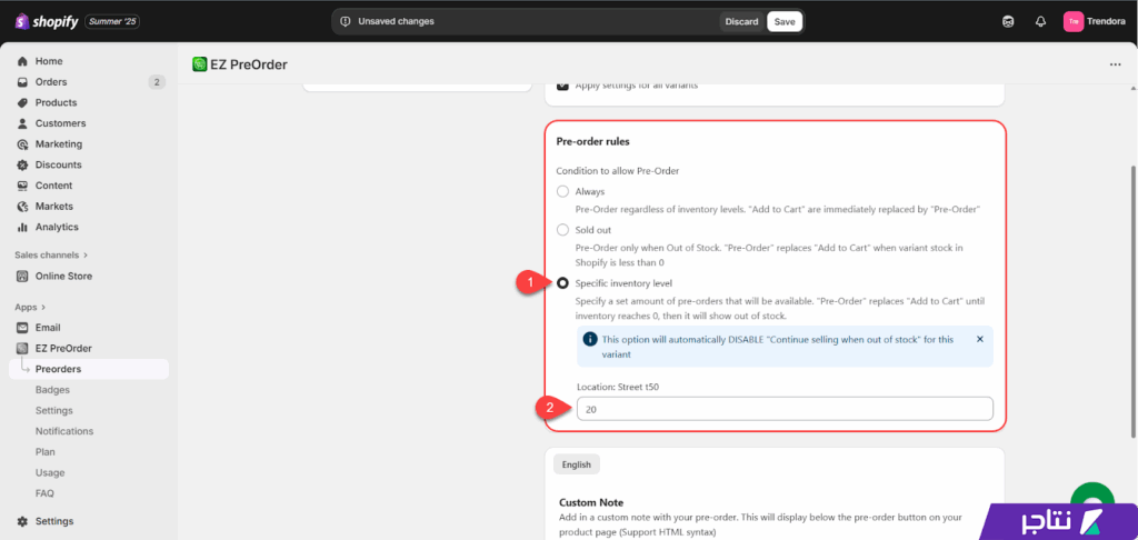 - Specific inventory level: لتفعيل البيع المسبق عند نفاد الكمية، مع إمكانية تحديد حد أقصى من الطلبات المسبقة للتحكم في حجم المبيعات.