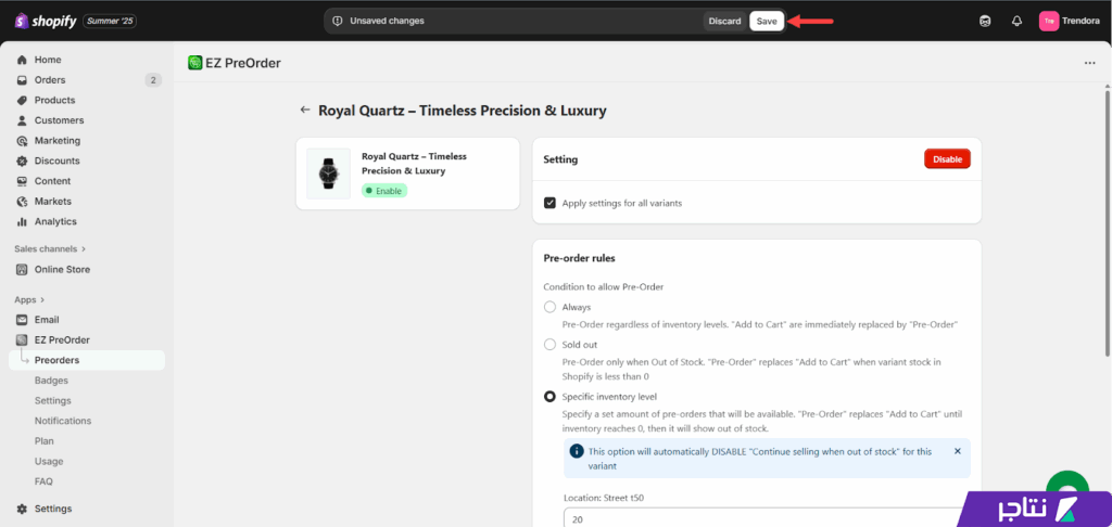 وأخيرًا، وبعد الانتهاء من ضبط جميع الإعدادات، ضغطت على زر "Save" لحفظ التعديلات وتفعيل البيع المسبق للمنتج على المتجر.