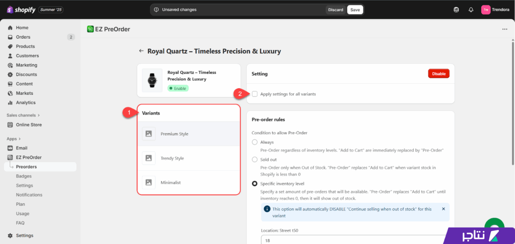 في حال كان المنتج يحتوي على مجموعة من المتغيرات، يمكنك تفعيل الطلب المسبق لأحد المتغيرات فقط أو لجميع المتغيرات، مع إمكانية تخصيص إعدادات منفصلة لكل متغير على حدة.