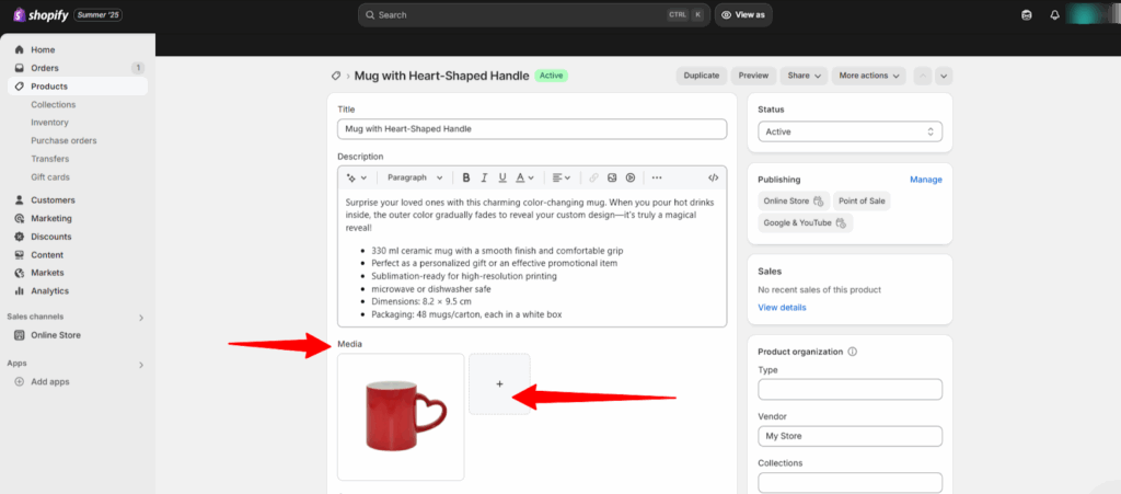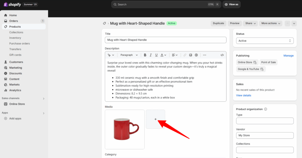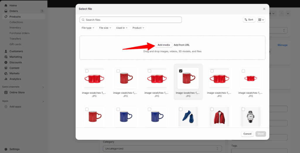 - بعد استعراض صفحة تحرير المنتج، ومن قسم الوسائط، اضغط علامة + التي تشير إلى خيار إضافة وسائط (صور أو فيديو أو غيرها)