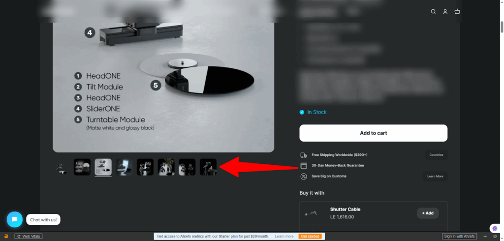 - صور متعددة الزوايا للمنتج: حيث تعرض المنتج من جوانب مختلفة وتظهر إما مع الصورة الرئيسية بالتمرير بين الجوانب المختلفة (Slider) أو في شريط خاص أسفل الصورة الرئيسية (يمكن تهيئة الأمر حسب الرغبة في متجرك.