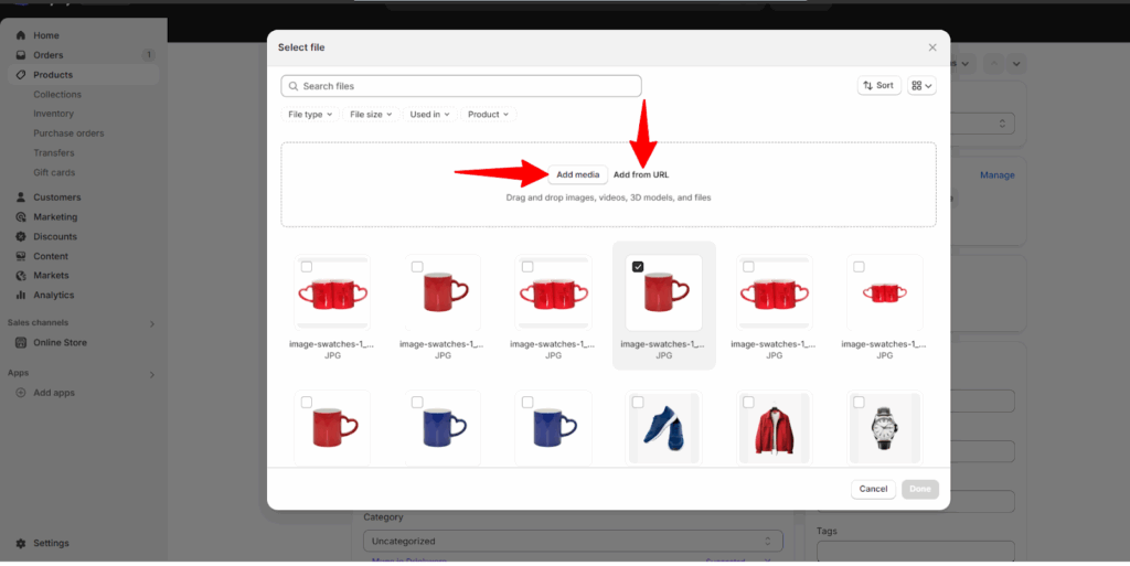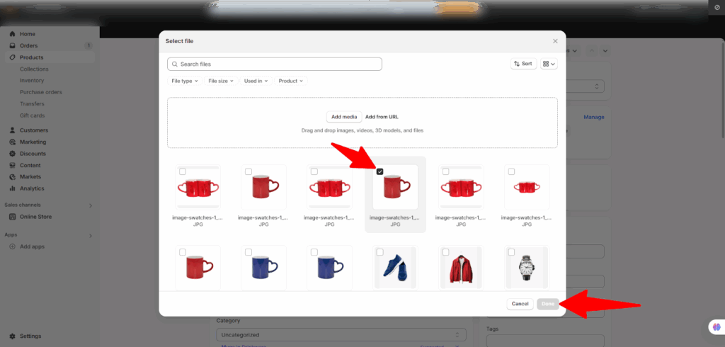 بعد اختيار الصور وضبط معاييرها القياسية قبل الرفع، حان وقت رفعها في صفحة المنتج..