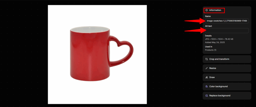 - بعد رفع الصورة، يمكنك الآن إدخال بيناتها فيما يتوافق مع معايير محركات البحث لكي تسهل على محرك البحث الزحف إليها وأرشفتها وفهمها. وذلك بالنقر على الصورة بعد الرفع، لتظهر لك النافذة التالية: