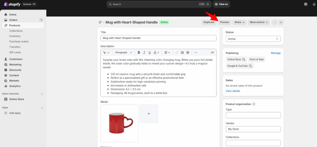 - يمكنك استعراض صفحة المنتج لكي تتأكد أن كل شيء على ما يرام، وذلك بالضغط على "معاينة" أو "Perview"