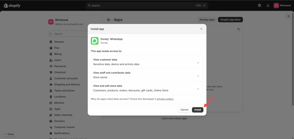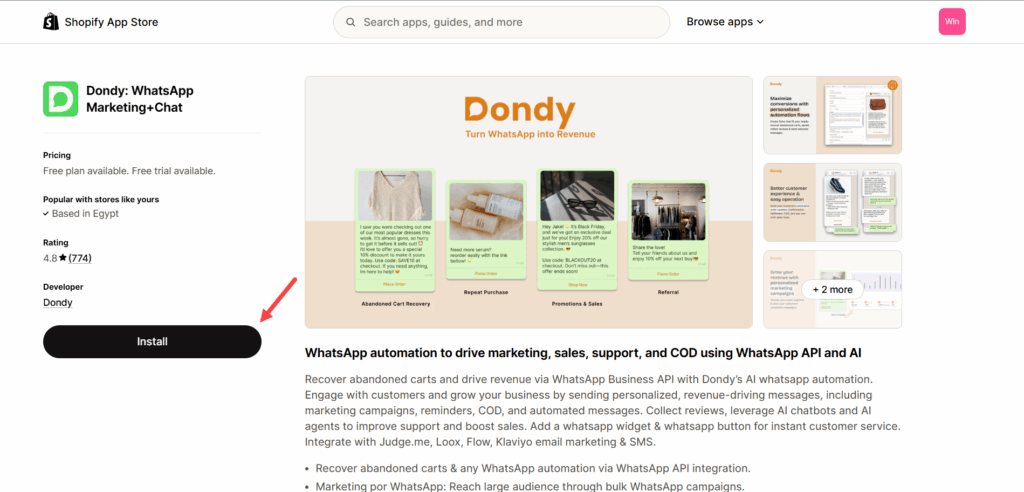 في البداية، تحتاج إلى تثبيت تطبيق Dondy: WhatsApp Marketing + Chat على شوبيفاي، وذلك من خلال التوجه إلى متجر تطبيقات شوبيفاي، ثم البحث عن التطبيق والضغط على زر "Install" لبدء التثبيت.