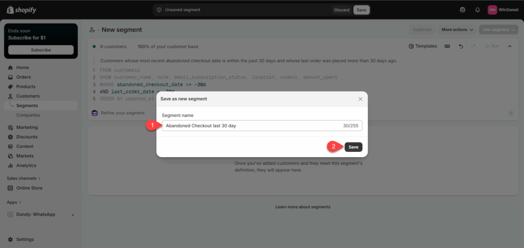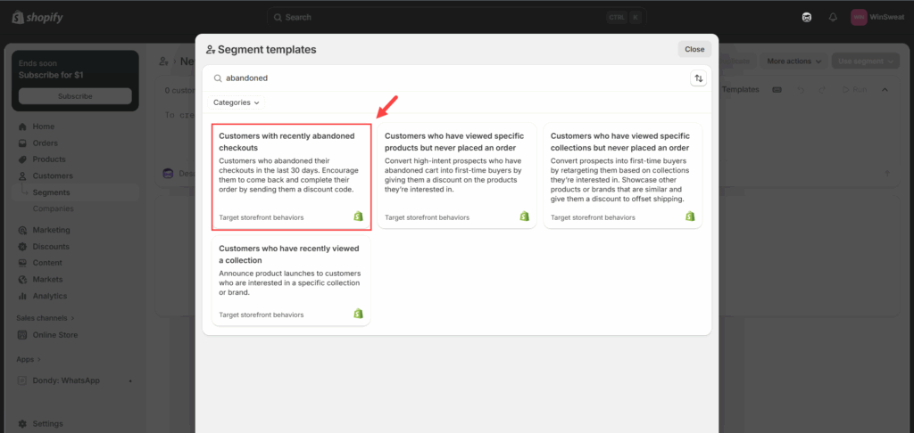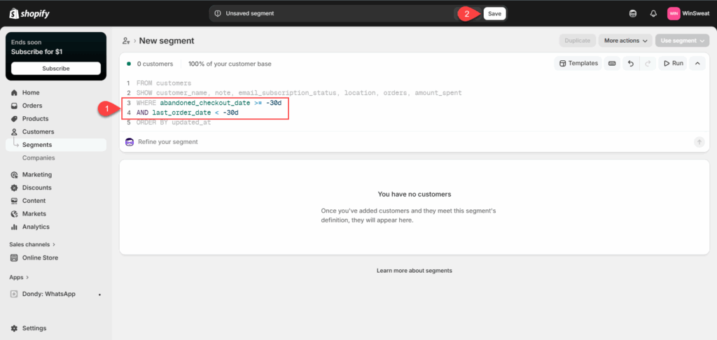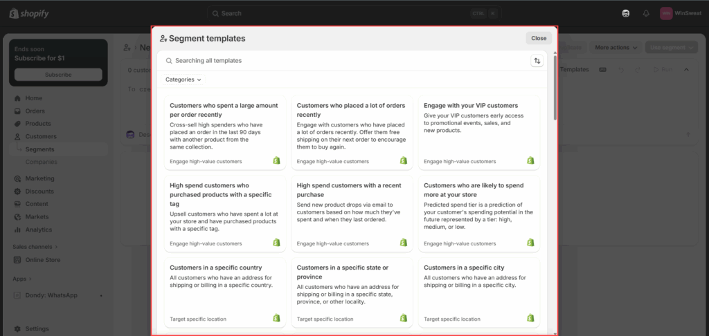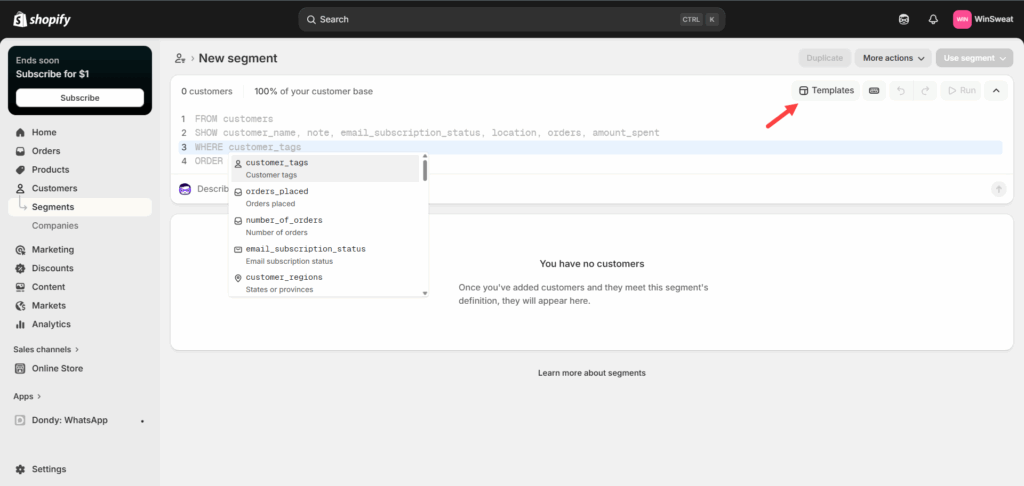 بعد ذلك، يمكنك كتابة شروط مخصصة لتحديد العملاء المستهدفين، سواء بناءً على عدد الطلبات، أو قيمة المشتريات، أو غير ذلك. وفي حال عدم امتلاك خبرة في كتابة الشروط، يمكنك الاعتماد مباشرة على النماذج الجاهزة من خيار Templates.