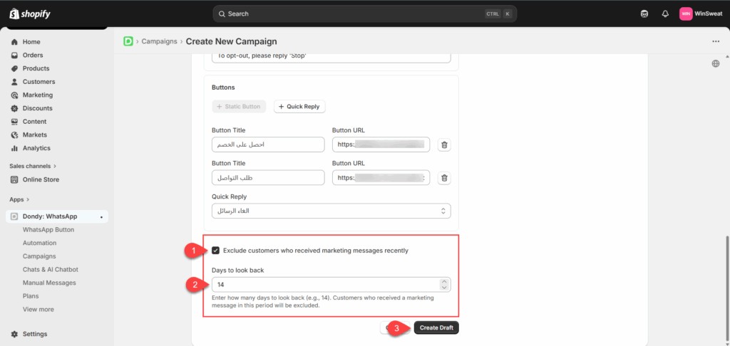 وفي النهاية، فعّلت خيار Exclude customers who received marketing messages recently، لتجنّب إرسال الحملة إلى العملاء الذين تلقّوا رسائل تسويقية مؤخرًا (مثل خلال 14 يومًا)، مما يساعد على تقليل الإزعاج وتحسين تجربة العملاء.