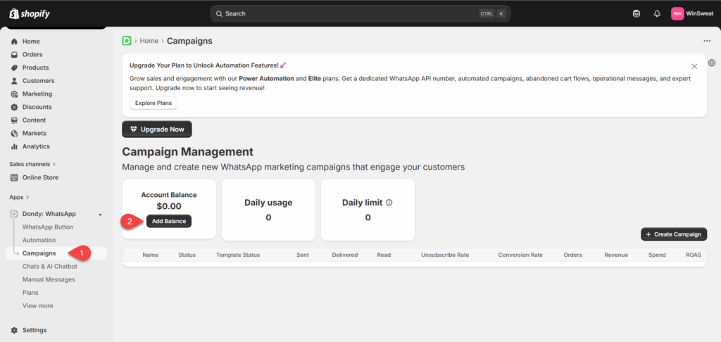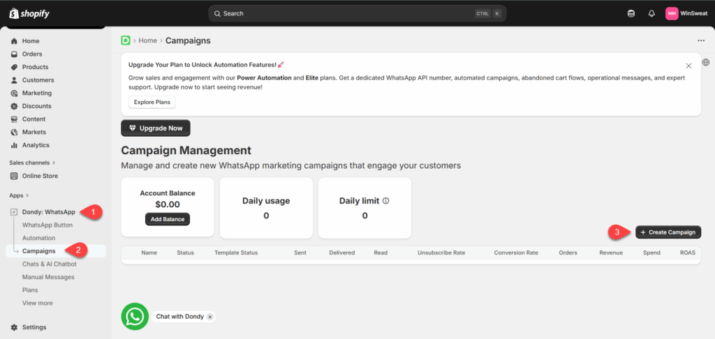 الآن أصبحت جميع متطلبات الحملة التسويقية جاهزة، لذلك توجّهت إلى المسار: Dondy: WhatsApp >> Campaigns، ثم ضغطت على زر Create Campaign لبدء إنشاء حملة تسويقية جديدة على المتجر.