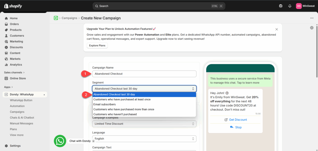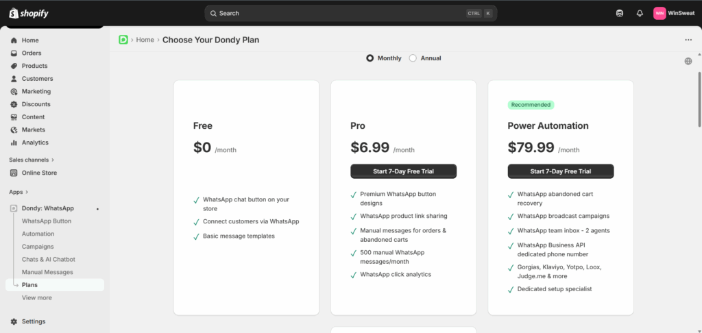 ولاستخدام ميزة الحملات التسويقية في تطبيق Dondy، تحتاج إلى الاشتراك في إحدى الخطط المدفوعة، والتي تبدأ من خطة Pro بتكلفة 7 دولارات شهريًا. أما إذا رغبت في إرسال الحملات التسويقية من رقمك الخاص مباشرة، فستحتاج إلى الترقية إلى خطة Power Automation، التي توفّر هذه الميزة إلى جانب باقي المزايا المتقدمة في التطبيق.