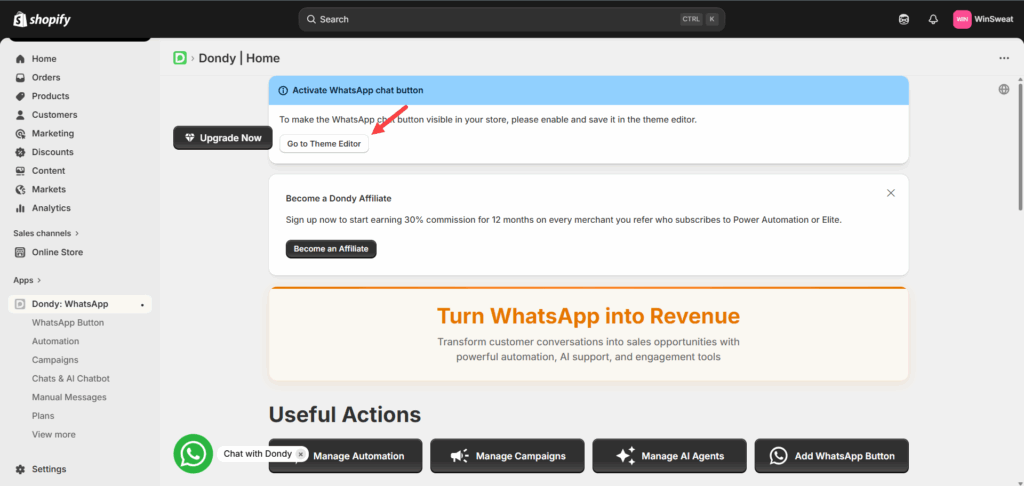 ميزة التسويق عبر WhatsApp لا تكون فعّالة بشكل مباشر على متاجر شوبيفاي، لذلك نحتاج إلى تثبيت تطبيق مساعد يوفّر هذا التكامل. ومن أبرز التطبيقات التي أعتمد عليها كثيرًا لربط واتساب مع شوبيفاي تطبيق Dondy، حيث يتيح إضافة دردشة واتساب إلى المتجر، وبناء أتمتة واتساب على شوبيفاي، بالإضافة إلى إنشاء الحملات التسويقية التي يمكن الاعتماد عليها في الاستراتيجية التي سوف نشاركها في الخطوات التالية.