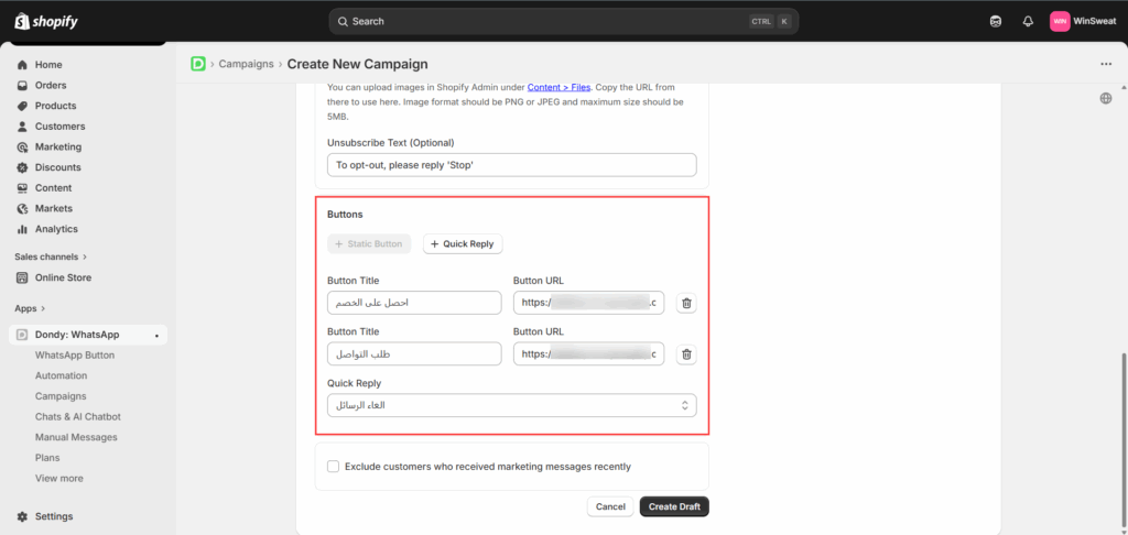 بعد ذلك، خصّصت الأزرار المختصرة التي تظهر داخل الرسالة، من خلال تحديد اسم الزر والرابط المرتبط به. على سبيل المثال، أضفت زرًا للتحويل إلى صفحة العرض من المتجر، وآخر للتواصل مع فريق الدعم.