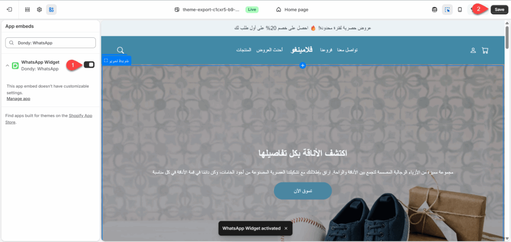 بعد ذلك، فعّلت إضافة WhatsApp Widget على المتجر، ثم ضغطت على زر "Save" لحفظ الإعدادات وتطبيقها.